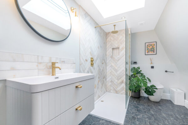 The second room created by this mansard loft conversion is a stunning bathroom, which has one skylight in the ceiling, letting in lots of bright light. There are lots of patterns in this bathroom, with a gorgeous hexagonal pattern for the flooring, and parquet-style shower tiles. The lighter shower tiles compliment and balance the darker colour for the floor, whilst also making the gold features standout. Using standout colours on particular features like the taps, shower head and shower curtain rail, makes this bathroom look royal with these golden touches.